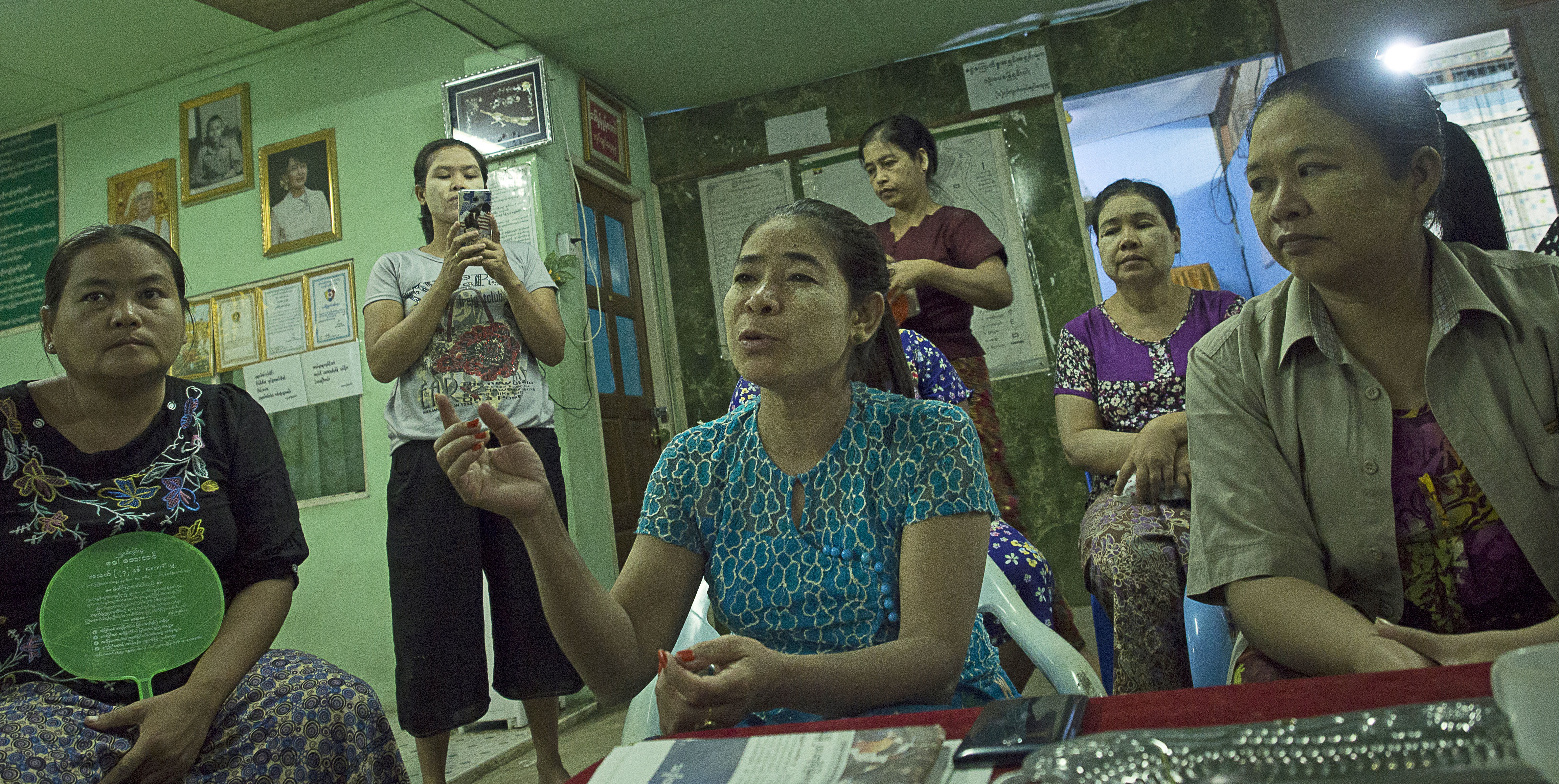 Utöver de nattliga patrullerna har Mon Mon Aung öppnat upp sitt kontor för stadsdelens invånare. Dit kan de kan vända sig dygnet runt om de har problem. Ett par gånger i veckan kommer kvinnor som har misshandlats av sina män. Det är ingen självklarhet. På andra stadsdelskontor finns skyltar uppsatta med uppmaningen ”kom inte hit med äktenskapsproblem”, berättar Mon Mon Aung.