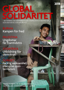 Global Solidaritet är en tidning om Palmecentrets arbete i olika delar av världen.Tidningen innehåller texter om människor från bland annat Burma, Palestina, Sydafrika och Turkiet som kämpar för en bättre värld. LO:s ordförande Karl-Petter Thorwaldsson samtalar med Palmecentrets Anna Sundström om organisering för att bekämpa globala orättvisor. Här finns också en tävling med fina priser.