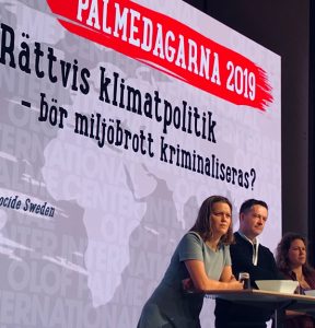 Fackföreningsrörelsen och miljörörelsen möttes i ett spännande samtal mellan Per-Olof Sjöö, ordförande i GS-facket och Pella Thiel från End Ecocide Sweden. End Ecocide vill att ekocid – förstörelse av livsmiljöer – ska bli det femte brottet som man kan ställas till svars för vid den Internationella Brottsmålsdomstolen i Haag. En annan fråga som diskuterades var om naturen självt kan få juridiska rättigheter, så att man därmed kan man stämma den som tex förgiftar en flod.